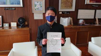 本年度もおば中賞の表彰を行っていきます。善行をほめていく取組です。本日第1号の表彰を行いました。