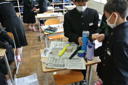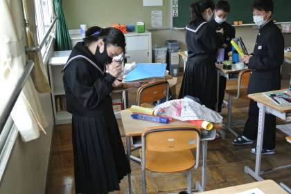 1年生は、来週の宿泊学習に向けて準備を進めています。今日はレクリエーションのための小道具を作ったり、クイズを考えたりしました。