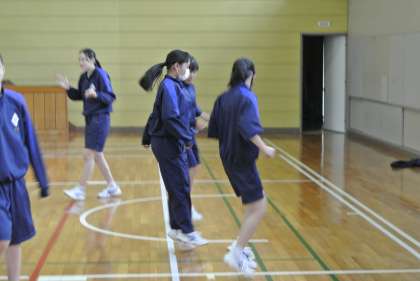 2・3年生が1年生に「おば中ソーラン」の踊り方を教えています。