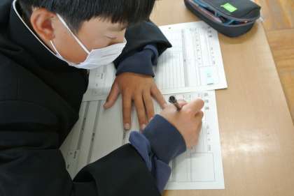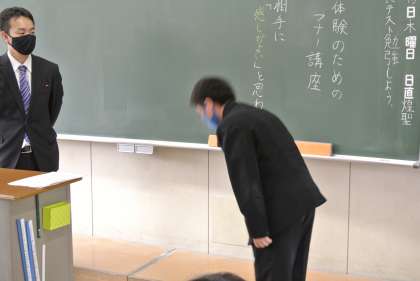 2年生は、職場体験学習に向けて、履歴書(自己紹介)を書いたり、あいさつや返事、お辞儀の仕方などを確認したりしました。