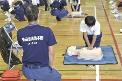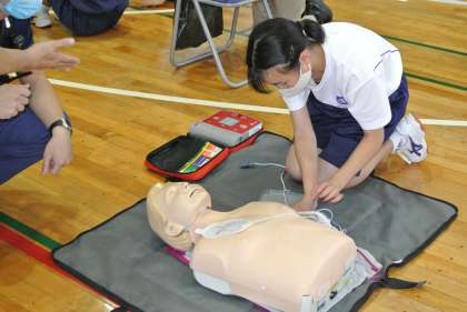 消防署の方にお越しいただき、応急手当講習会を行いました。胸骨圧迫の仕方とAEDの使い方を学びました。