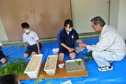 1年生が四季桜の挿し木をしました。根が出たら3月頃に植え替えをし、卒業時には大きく育った苗を家に持ち帰る予定です。桜ライン311を通し、陸前高田市にも贈る予定です。