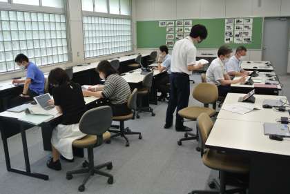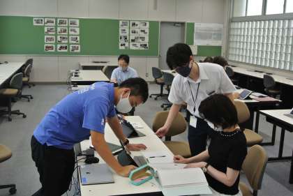 教員が、ICT支援員を講師にタブレットの使い方について学びました。