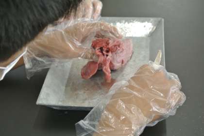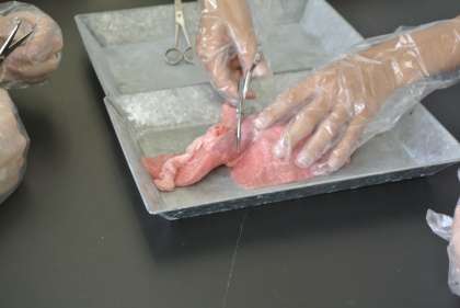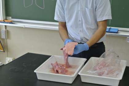 2年生は理科の授業で、「肺のつくりとはたらき」について学習しています。今日は本物の豚の肺を解剖し、そのつくりを観察しました。