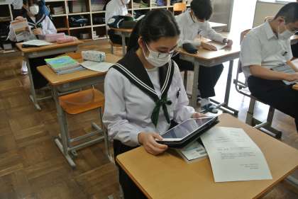 さまざまな場面でタブレットを使うことが多くなっています。写真は上段は美術の授業で絵を鑑賞している様子、下段は朝の健康観察をしている様子です。