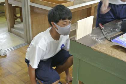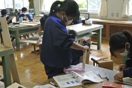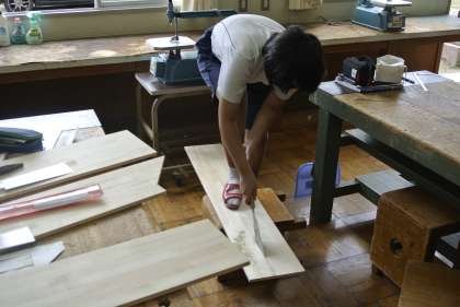 1年生は技術科の時間に、木工により本棚やテーブルなどを作っています。のこぎりで切断した面がまっすぐになるようヤスリをかけていました。