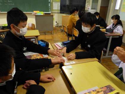 カードを使って、ゲーム感覚で「比較級」の学習をしています。
