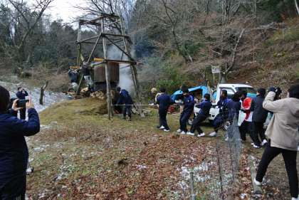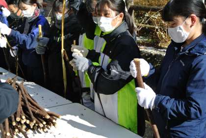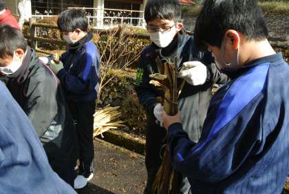1年生がカンゾカシキに参加しました。寒い中でしたが、手際よくコウゾの皮をむいていました。