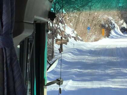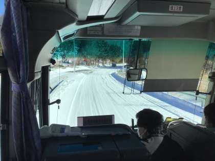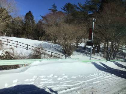 茶臼山高原道路を走行中です。天気は良いですが、路面にかなりの雪が残っています。