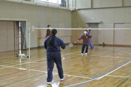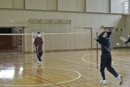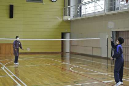 体育では密にならないようにバドミントンを行っています。