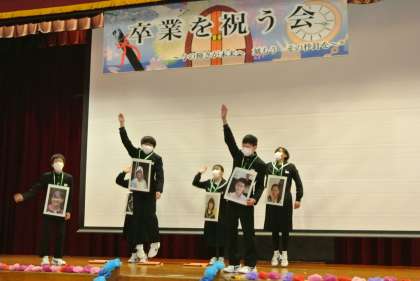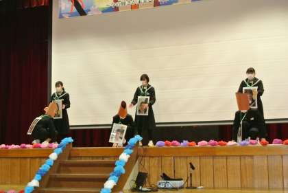 卒業を祝う会を行いました。これまで1・2年生が一生懸命に準備し、劇やクイズ、踊り、思い出ビデオ、ステンドグラスの披露などを行い、心温まる会となりました。歌が歌えないので、3年生からはダンスのお返しがありました。