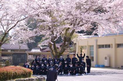 桜の木の下で学級写真を撮りました。