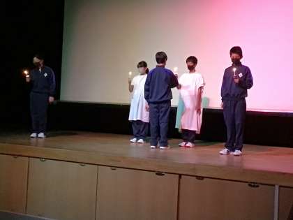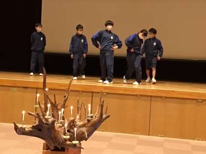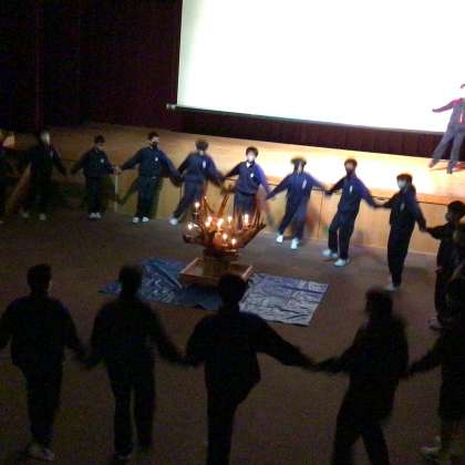 キャンドルサービスを行いました。各班の出し物やマイムマイムを踊って楽しみました。最後には一人一人が中学校生活の目標を発表しました。