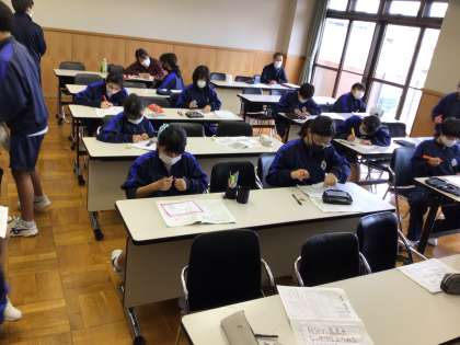 研修室で中学校生活の決意を布に書きました。後日これをつなげて学級旗にする予定です。