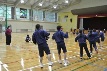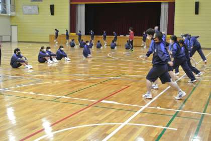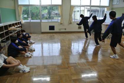 ソーランの練習が始まりました。2・3年生が1年生に教えていきます。