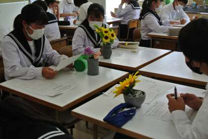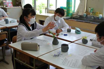 2年生美術では、フラワーベースを作ります。今日はその試作品を見合い、意見交換を行いました。