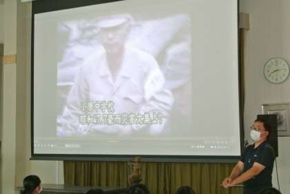 今年は47災害から50年です。当時のことを風化させたくない、災害意識を高めたいなどの思いから、夏休みに中学生が当時の様子を取材するという取組を実施します。本日の全校集会でその方法について小原支所の方から説明を聞きました。