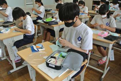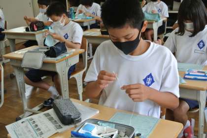 1年生は、家庭科の授業で裁縫を学習しています。今日はボタン付けの練習をしました。