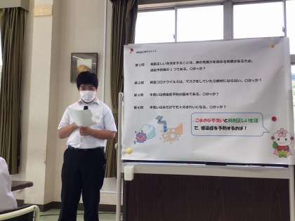 保健委員会が給食の時間に、感染症対策について発表しました。月曜日から毎日少しずつ発表し、今日はクイズで締めくくりました。