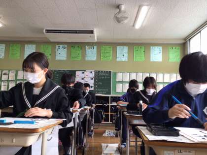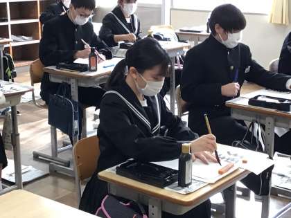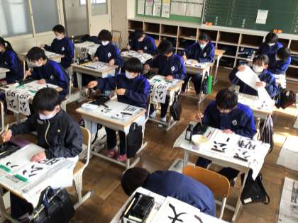 全校集会、学級活動を行った後、書き初め大会を行いました。1年生は「公明正大」、2年生は「笑門来福」、3年生は「理想の実現」を書きました。