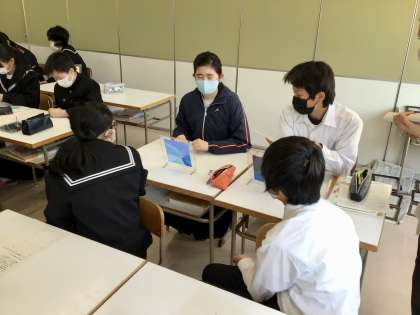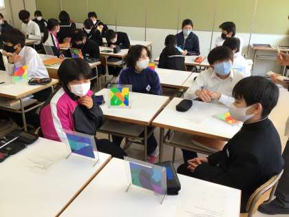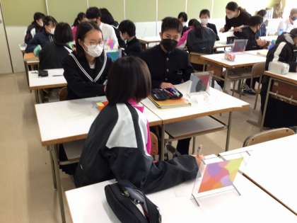 「感情を色で表現しよう」の作品を完成させました。今日はその作品をグループで鑑賞しました。