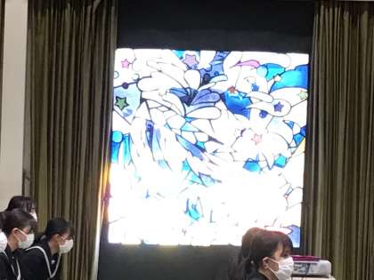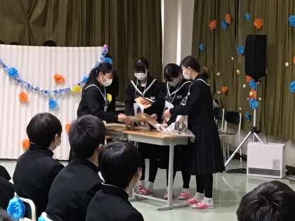 卒業を祝う会を行いました。1・2年生が心を込めて準備をしてきました。ステンドグラスの披露、思い出を振り返る寸劇やビデオをなど、また3年生からの返礼があり、心温まる会となりました。