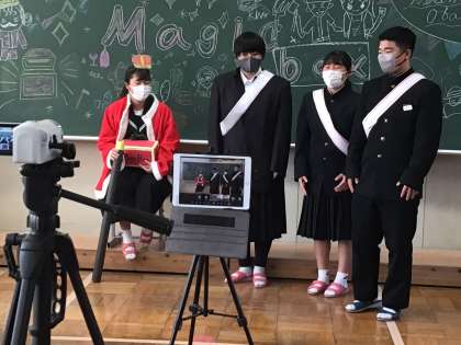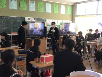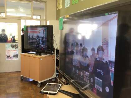 相手に伝わるようにゆっくり話したり、ジェスチェーを工夫したりして、いよいよ発表会です。小原地区の道慈小、本城小、小原中部小の高学年の児童とオンラインで繋ぎ、発表会をしました。小学生は、中学校で英語を勉強するのを楽しみにしてくれたようです。