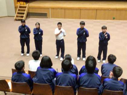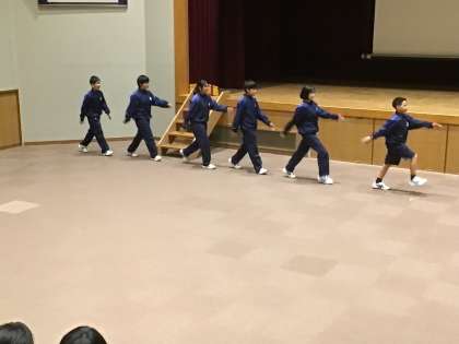 行進などの集団行動を練習しました。班ごとに発表し、最後はポーズを決めました。