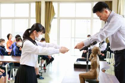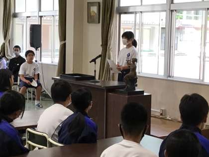 全校集会を行いました。学校賞の表彰と1年生代表生徒が宿泊学習の成果を発表しました。