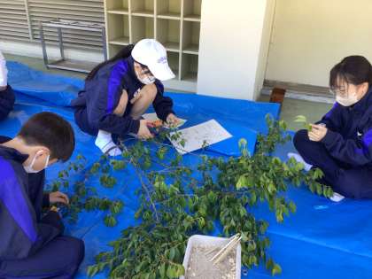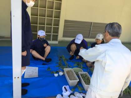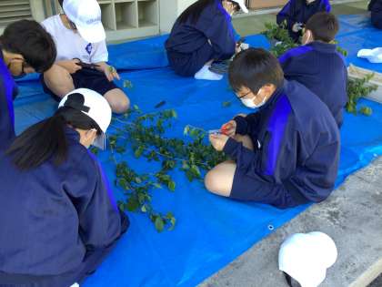 1年生が四季桜の挿し木をしました。今年も地元の講師の方からやり方を教えていただきました。プランター15箱、約500本を挿しました。