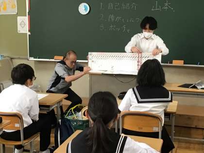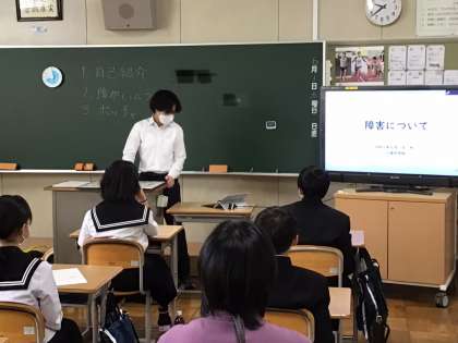 1年生が小原学級との交流会に向けて、障がいについて学びました。小原学級の先生にお越しいただき、具体的な接し方や注意点など、詳しく教えていただきました。
