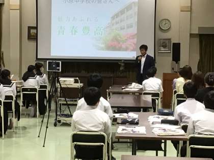 高校説明会を開催しました。市内8校の説明を聞きました。多くの保護者の皆様にも参加していただきました。