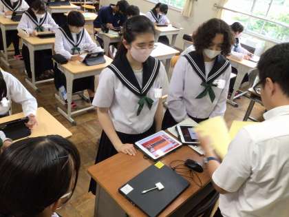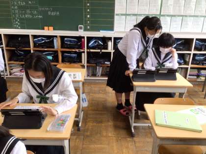 2年生は、タブレットを使って職場体験学習の成果をまとめています。