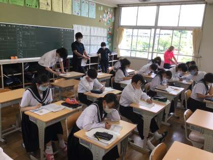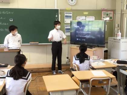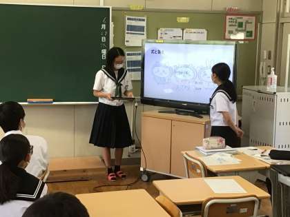 2年生数学の授業研究を行いました。生徒はパワーポイントを使って連立方程式の解き方を解説しました。