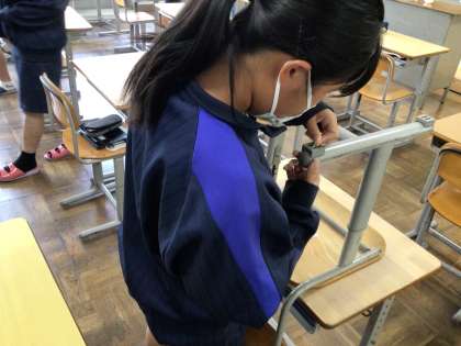 今週は環境委員による掃除強調週間です。今日は机と椅子の脚に付いたほこりを竹串などを使って除去しました。