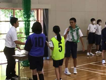 夏休み前の全校集会を行いました。各種表彰や夏休みの過ごし方の話などを聞き、最後に生徒会によるレクリエーションを行いました。
