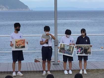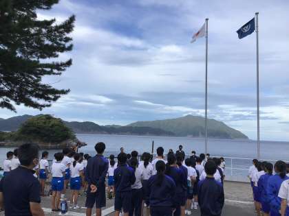 朝のつどいを行いました。少し風が強いですが晴れています。全員元気です。