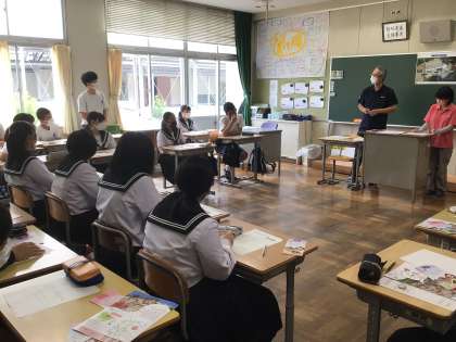 講師に、観光協会の方をお招きして、四季桜まつりでの地域ボランティア活動について、情報をいただきました。活動するにあたって、わからないことや注意することなど質問して、理解を深めました。これから、具体的に考えていきます。