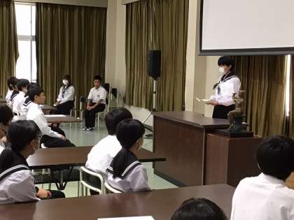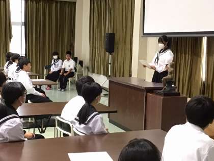 前期終業式を行いました。各学年の代表者による前期の反省と後期の心構えについてのスピーチ、職場体験学習と自然教室の成果発表、校歌斉唱などがありました。式の前には学校賞の表彰式、生徒会役員等の任命式を行いました。