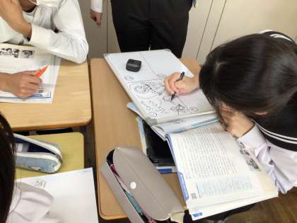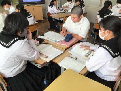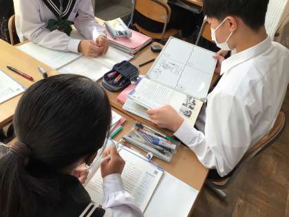 英語科の研究授業を行いました。英文を読み、グループで内容をイラストにし、説明し合いながら理解を深めました。