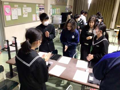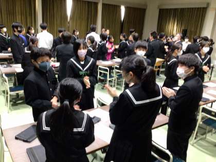 全校集会を行い、周回鍛錬の班の顔合わせをしました。生徒会役員が考えた簡単なゲームをして交流しました。