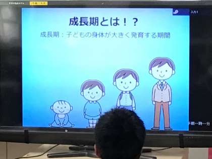 食育の授業を行いました。1年生が参加し、成長期に必要な栄養について学びました。