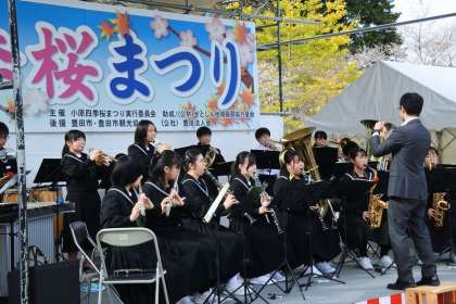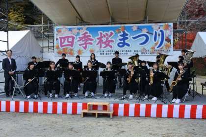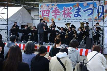 四季桜まつり会場で、吹奏楽部が演奏を披露しました。多くの観光客の方に聴いていただきました。