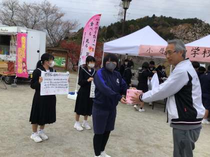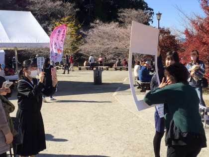 3年生と特別支援学級が四季桜まつり会場で活動しました。3年生は、地域貢献活動として四季桜WOODクラフト、食べ物マルシェ、観光案内パンフレットの配布、フォトブース、募金活動、アンケート調査を行いました。特別支援学級は今年3回目の苔玉とリサイクル瓶の販売を行いました。多くの観光客に中学生の活躍を見ていただきました。