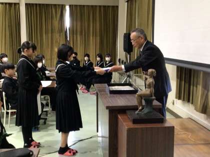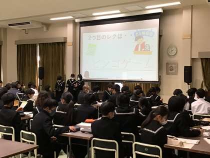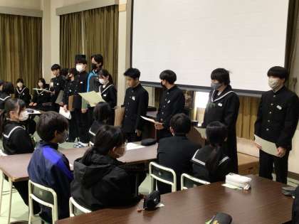 冬休み前の全校集会を行いました。大会やコンクールの表彰披露の他に、歌舞伎保存会からの感謝状贈呈もありました。最後に生徒会役員によるレクリエーションで楽しみました。