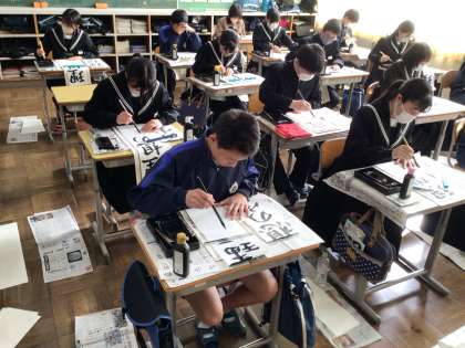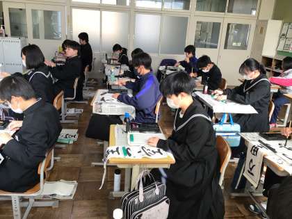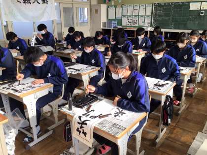 3年生「理想の実現」、2年生「笑門来福」、1年生「万里一空」を書きました。
