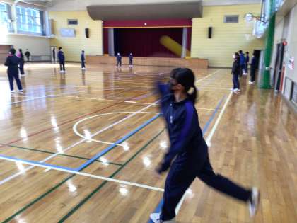体育ではティーボールというベースボール型のゲームを行なっています。今日は送球の練習を行いました。