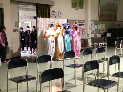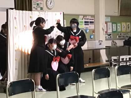 卒業を祝う会を行いました。1・2年生が心のこもった会を作り上げました。3年間を振り返る劇やビデオ、和紙で作ったステンドグラスの披露、呼びかけ、ソーラン節、クイズなど盛りだくさんでした。3年生からのお礼のダンスもありました。