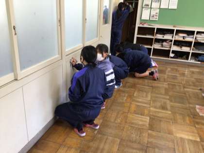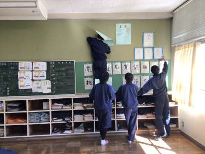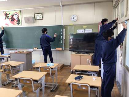 教室の片付けをしています。掲示物をはがしたり、普段できない所の掃除をしたりしました。明日ワックスがけを行う予定です。