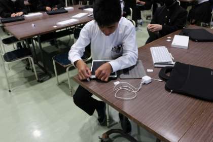 全校でタブレットの使い方について確認をしました。ていねいに扱う様子が見られました。